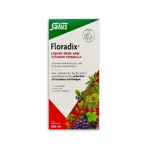 Floradix Liquid Iron and Vitamin Formula is a comprehensive dietary supplement that provides nutritional support to help reduce tiredness and fatigue.