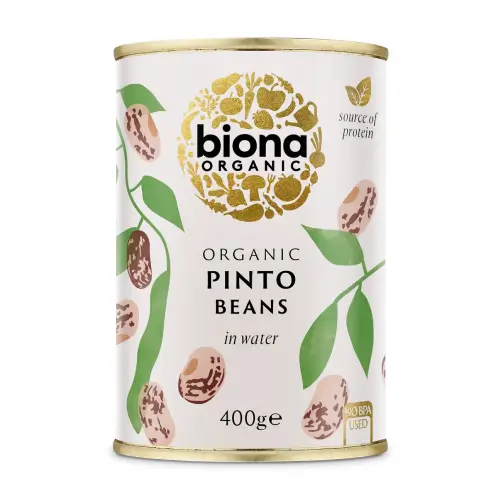 Biona Organic Canned Pinto Beans are 100 percent natural, with no added salt or sugar and come in a BPA free can. They are a great source of plant based protein, fibre, iron and magnesium as well as being naturally low in fat, salt and sugar.