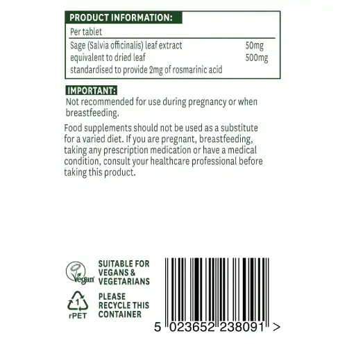 Our Sage Leaf tablets provide a 50mg extract, which is the equivalent of 500mg of dried sage leaf. Each tablet is guaranteed to provide 2mg of rosmarinic acids. These tablets are also free from thujone, a component of sage that should not be consumed regularly. The tablets are suitable for vegans and free from lactose, wheat and gluten.